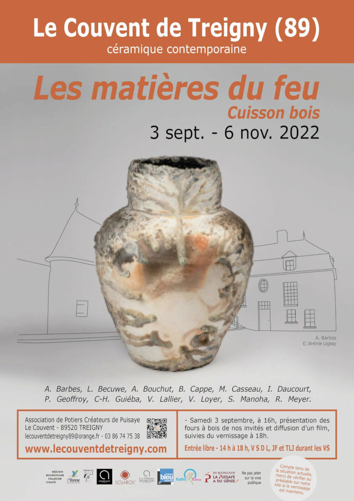 Une très belle exposition commence autour des matières et des histoires racontées par les cuissons au bois sur les oeuvres en céramiques. Le couvent de Treigny accueille et présente un éventail de pièces allant de l'infiniment petit ( presque ) à l'infiniment grand ( quasiment ). Cette exposition géante présente les créations d'Audrey Barbes ( sur l'affiche ), Lucie Becuwe, Anny Bouchut, Boris Cappe, Mathieu Casseau, Isabelle Daucourt, Pascal Geoffroy, Charles Henri Guiéba, Vincent Lallier, Virgile Loyer, Simon Manoha et Raphël Meyer.